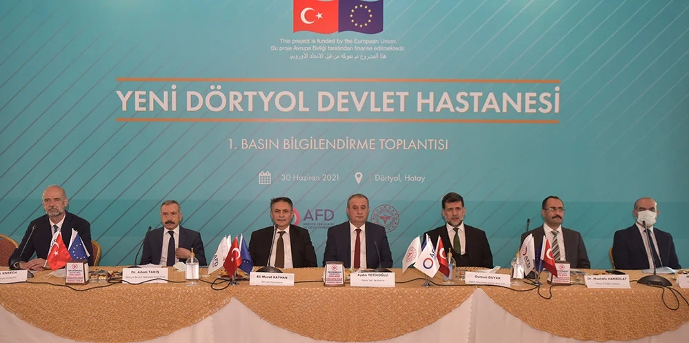 Deputy Governor of Hatay Aydın Tetikoğlu, Deputy Director of General of Health Investments of the Ministry of Health Dursun Duyar, Hatay Provincial Health Director Dr. Mustafa Hambolat, French Development Agency Turkey Director Serge Snrech, Dörtyol District Governor Ali Murat Kayhan, Head Doctor of Dörtyol State Hospital Adem Takiş and Head of Construction Applications Department of the Ministry of Health Muzaffer Geleri attended the press conference held in Dörtyol.