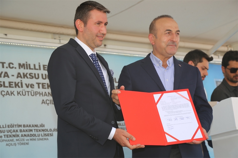 ''Workplace Delivery Record'' was delivered to the Contractor Company by Foreign Minister Mevlüt Çavuşoğlu in the delivery ceremony held during the opening of the Airplane Library, Museum and Mini Cinema Hall with the participation of Foreign Affairs Minister Çavuşoğlu in the yard of Aksu Aircraft Maintenance Technology Vocational and Technical Anatolian High School.